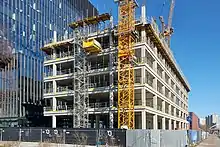 In July 2020, the structure of the building reached 60 metres (200 ft). In November of the same year, work was underway on the last office floors. Work was also carried out on the assembly of facade panels, which covered two of the three cuboids of the building in their entirety. In December 2020, the structure of the skyscraper was 115 metres (377 ft) and the last usable floor was being built.[11]