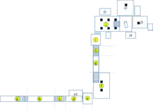The square antechamber leads onto the pillared burial chamber with sarcophagus emplacement;[1] a rectangular pit, likely for the king's canopic equipment, is present at the southern end of the chamber.[6] There are three small side rooms leading off the burial chamber and two larger chambers with a single pillar; each has an additional side chamber.[1] One of these suites seems to have always been intended for the burial of a queen, while the other seems to have been a fourth side chamber and only enlarged after the fact, based on chisel marks and the position of the magical niches. The expansion is presumably due to Sitamun's elevation to Great Royal Wife late in Amenhotep III's reign. This situation is paralleled at Malkata, where Sitamun's rooms were squeezed in between those of her parents.[4][3]