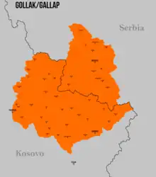 Gollak (Albanian definite form: Gollaku; Serbian: Гољак, romanized: Goljak) or Gallap (Albanian definite form: Gallapi) is a mountainous and ethnographic region in the eastern part of Kosovo and partially in Serbia, bordering the Llap region to the North, the Kosovo field to the west, the Anamorava valley to the south and straddling along the border with Serbia.[2] The cities of Prishtina and Gjilan in Kosovo are located by the mountains. The highest peak, Gollak-Lisica, has an elevation of 1,186 m (3,891 ft) above sea level.[3] Gollak itself is split into Upper Gollak and Lower Gollak.