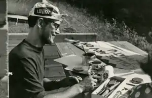 When Kurismaa was not accepted to the music school in 1957 in Tallinn, he decided to enroll in the Tartu Art School. In 1965, Kurismaa started to work as an artist-decorator for the Tallinn Department Store while also commencing studies in monumental painting at the State Art Institute. Work at the Tallinn Department Store (opened in 1960, brand name Tallinna Kaubamaja) offered a variety of ways to experiment with readymade materials and forms, as well as opportunity to exhibit his works in the department store’s exhibitions. His first kinetic object stems from the year 1966 and is also the first kinetic object in Estonian art history. It has not survived, but consisted of a fireplace grid and several kitchen utensils.[2]