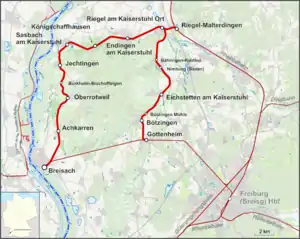 The Kaiserstuhlbahn consists of two joined sections, from Gottenheim via Riegel Ort to Endingen am Kaiserstuhl, and Riegel DB station via Endingen am Kaiserstuhl to Breisach. Together these lines circumnavigate the Kaiserstuhl mountain range on its east, north and west sides. At both Gottenheim and Breisach junctions are made with the Freiburg to Breisach Railway, which completes the circumnavigation to the south. At Riegel DB station, a further junction is made to the Freiburg im Breisgau to Offenburg section of the mainline Rhine Valley Railway.[1]