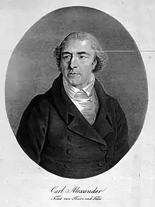 Karl Alexander was born as the son of Karl Anselm, 4th Prince of Thurn and Taxis and his first wife, Duchess Auguste of Württemberg.[1] He studied at the Universities of Strasbourg, Würzburg, and Mainz and then subsequently went on a European tour. In 1797, he was appointed successor to his ailing father's position as Prinzipalkommissar at the Perpetual Imperial Diet in Regensburg. Karl Alexander also worked for the Thurn and Taxis postal empire, operating during a decline due to the gradual loss of territory as a result of the Napoleonic Wars.