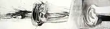 As Götz moved away from clearly defined forms, his approach to painting became more dynamic. In a technique Götz has continued to use throughout his later painting career, the image is developed through a lengthy, intense process, often involving a large number of preliminary sketches and gouaches. Once the preparation is complete, the artist applies dark paint onto a light background with a paintbrush, working in a fast and focused way. The paint is then "raked" - partially removed using a type of spatula known as a "rake" - before the contrast between the light and dark areas of the still-moist surface is softened using a dry paintbrush.[18][19]