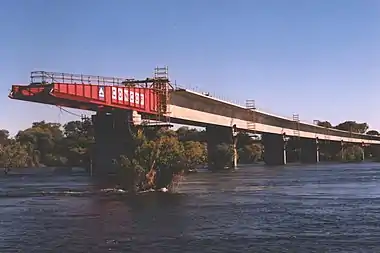 The Katima Mulilo Bridge (also known as Bridge 508 in the Namibian Bridge Register) carries the TransCaprivi Highway over the Zambezi River between Katima Mulilo, Namibia and Sesheke, Zambia. It is a road bridge, completed in 2004, 900 metres long and with 19 spans.[1] It links Namibia's Trans–Caprivi Highway to the Zambian road network, forming a section of the trade route from south-central Africa to the Atlantic known as the Walvis Bay Corridor (Walvis Bay-Ndola-Lubumbashi Development Road). It also carries tourist traffic.[2]