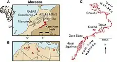 The Kem Kem Group (commonly known as the Kem Kem beds[2]) is a geological group in the Kem Kem region of eastern Morocco, whose strata date back to the Cenomanian stage of the Late Cretaceous. Its strata are subdivided into two geological formations, with the lower Ifezouane Formation and the upper Aoufous Formation, with the Gara Sbaa Formation and Douira Formation used in the southern Tafilalt region.[3] It is exposed on an escarpment along the Algeria–Morocco border.