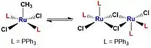 Upon dissociation of phosphine, RuCl2L3 equilibrates with the dimer species [RuCl2L2]2.