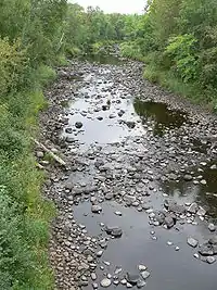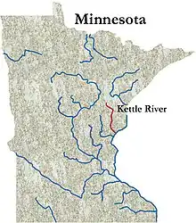 The Kettle is an 83.6-mile-long (134.5 km)[1] tributary of the St. Croix River in eastern Minnesota in the United States. Via the St. Croix River, it is part of the watershed of the Mississippi River. The river's English name is due to the large number of large rounded holes (kettles) in the sandstone in and around the river, carved out by the swirling waters of the river. The river's Dakota name Céġa watpa[2] entered into English via the Anishinaabe people's Akiko-ziibi, both meaning "Kettle River".[3]