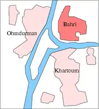 Khartoum North, or Khartoum Bahri (Arabic: الخرطوم بحري, romanized: al-Kharṭūm Baḥrī), is a city in Khartoum State, lying to the north of Khartoum city, the capital of Sudan.