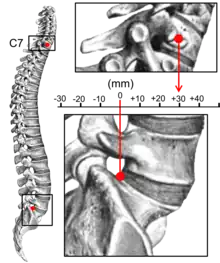 Kyphosis can be graded in severity by the Cobb angle. Also, sagittal balance can be measured. The sagittal balance is the horizontal distance between the center of C7 and the superior-posterior border of the endplate of S1 on a lateral radiograph.[15]