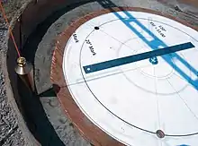 Thousands of years ago, many cultures used the plumb bob to find proper alignment and it was decided to use this technique to obtain perfect alignment. Two readings were taken separated by two hours to obtain a very accurate triangulated result. Exact positions of the sun for the Observatory location were taken from a smartphone using an astronomy application. A one lb wooden jig (substituting for the 250 lb steel mount) was pivoted so that the shadow from the plumb bob fell exactly along one of the pre-drawn lines. Once the alignment process was completed with the jig, guide holes were drilled into the concrete base before the actual steel pier was fitted atop. Once it was confirmed that the guide holes were properly aligned to the steel pier, three 12" threaded rods were epoxied into fully drilled holes and allowed to set over night.