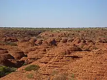 Three walks exist at Kings Canyon. The two km (return) and approximately one-hour Kings Creek Walk traces the bottom of the gorge. At the end of the walk is a platform, with views of the canyon walls above. The six km (loop) Kings Canyon Rim Walk traces the top of the canyon and takes three to four hours to complete.[6] A steep climb at the beginning of the walk, which locals call "Heartbreak Hill" (or "Heart Attack Hill", due to its steepness), takes visitors up to the top, with views of the gorge below and of the surrounding landscape. About half way during the walk, a detour descends to the Garden of Eden, a permanent waterhole surrounded by plant life. The last half of the walk passes through a maze of weathered sandstone domes, reminiscent of the Bungle Bungle. A slow descent brings the visitor back to the starting point. The loop can also be done in reverse (anti-clockwise), but the National Park Rangers encourage visitors to walk in one direction. Access to the walk may be restricted during hot weather.[7] The 22 km Giles Track connects Kings Canyon to Kathleen Springs and is popular with more adventurous hikers.