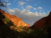 The Aboriginal (Luritja and Arrernte[2]) name for the creek and canyon is "Watarrka" (pronounced what-ARR-kah[3]), which is the Luritja word for the local umbrella bush (Acacia ligulata) that grows in the vicinity.[4] The national park thus gets its name from this landform.[2]