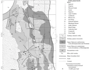 Ore deposits occurred mainly along major fault fissure veins. These faults may represent the outer margin of the Emory Caldera. Most mineralization occurred in the Late Oligocene.[7]