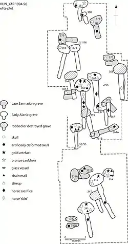 The site was discovered in the 1960s by the local archaeologist A.P. Runich. The construction of a cattle farm in the early 1980s led to rescue excavations, followed by research excavations by V.S. Flyorov (Moscow, Russia) from 1984, and by an Anglo-Russian team led by A.B. Belinskij (Stavropol, Russia) and H. Härke (Reading, UK) in 1993–1996. The total number of excavated graves is around 400; the full extent of the cemeteries is uncertain, but is probably somewhere between 1,000 and 3,000 graves.[1]