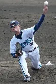 At 37 years of age, Kato was the oldest player to participate in the off-season tryouts conducted in November 2015. He faced three batters including his former teammate Kenichi Tagami and succeeded in getting all three out in only 8 pitches.[17] However, he did not receive a contract offer from any NPB clubs. In December 2015 he signed as a player/pitching coach with the Fukushima Hopes of the Baseball Challenge League. At the announcement of his signing, he indicated his intention to remain active as a player with the hope of rejoining the NPB the following season or even sooner should any team face pitching staff shortages during the 2016 season.[18]