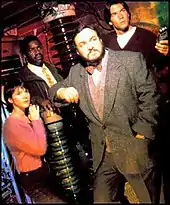 The original Sliders. From left to right: Wade Welles (Sabrina Lloyd), Rembrandt Brown (Cleavant Derricks), Professor Arturo (John Rhys-Davies) and Quinn Mallory (Jerry O'Connell)
