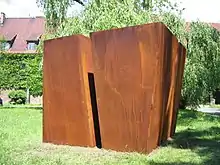 Against the backdrop of his qualifications in the field of landscape, it does not surprise that land-art objects and installation represent an important part of the current works by Kurt Fleckenstein. His objects deal with the surrounding landscape or town-scape. Strong encounters of the monumental, rust coloured objects which are a contrast to the green landscape come into being and connect with nature. Playing with gravity is particularly distinct in his work - when balls threaten to roll down a hill or cubes are ready to tip - but do not fall down. In his art he refers to minimalist positions and thus finds new ways to deal with reduction, so that an artwork is a thing by its own existence. “ That is what it is, no more and no less - it does not symbolise anything, it is just present in the context of its surroundings”. An example is the town entrance gate of Wroclaw.[4] A square measuring 8 by 8 meters defines the edge of town. At the same time the viewer establishes sight contact with the approaching town. The location and the context of the surroundings constitute the quality of the object. Other objects (photomontages) are located in almost untouched landscapes. In this examples the stress ratio between the geometry and pure nature in its spatial interaction is thematised.