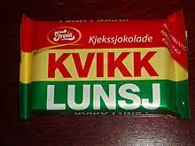 Kvikk Lunsj (English: Quick Lunch) is the name of a chocolate bar that was launched by the Norwegian chocolate sweets manufacturing company, Freia, in 1937[1] and has been sold ever since — with the exception of a period during and after WWII. Between 1941 and 1949, production was halted due to a shortage of sugar and the lack of quality flour.[1] The chocolate consists of four rectangular wafers covered in milk chocolate, with thinner layers of filler made from ground up discarded wafers and bars mixed with chocolate that is put between wafers in order to break the chocolate into pieces easier. The chocolate has been advertised as a "hiking chocolate", and it is often associated with skiing trips in Norwegian culture, especially during Easter vacation, where chocolate is often used to provide extra energy in packed lunches. Kvikk Lunsj is today owned and produced by Mondelez International and sold in Norway, Sweden, and Denmark.