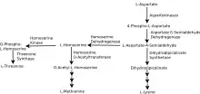 Homoserine represents another branch in the aspartate pathway, as it can progress down one of two pathways to eventually become one of two amino acids: threonine or methionine. This aspartate pathway is present in plants and bacteria, allowing them to synthesize lysine, methionine, and threonine. This pathway is not present in humans or other animals, however. The lack of this pathway means that humans need to take in these amino acids through their diet, which is why they are called essential amino acids.[6][7]