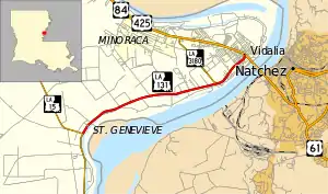 Louisiana Highway 131 (LA 131) is a state highway located in Concordia Parish, Louisiana. It runs 6.80 miles (10.94 km) in a southwest to northeast direction from LA 15 in St. Genevieve to U.S. Highway 84 (US 84) and U.S. Highway 425 (US 425) in Vidalia.