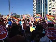 On 30 June 2013, Istanbul Pride parade attracted almost 100,000 people.[15] The protesters were joined by Gezi Park protesters, making the 2013 Istanbul Pride the biggest pride event ever held in Turkey.[16] The 2014 Istanbul pride attracted more than 100,000 people. The 2015, 2016, 2017, and 2018 pride parades were banned by local authorities, and participants were faced with police attacks. In June 2013, the first Izmir Pride took place with 2,000 participants.[17] On 3 June 2018, the 6th Izmir Pride Parade peacefully took place with over 50,000 participants.[18] Another pride took place in Antalya.[19] Politicians from the main opposition party, CHP and another opposition party, BDP also lent their support to the demonstration.[20] The pride march in Istanbul does not receive any support of the municipality or the government.[21][22]