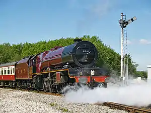 Following withdrawal in November 1962, 46201 was bought by the then Princess Elizabeth Locomotive Society straight from service. Initially it was kept at the Dowty Railway Preservation Society's premises at Ashchurch, and then subsequently at the Bulmers Railway Centre in Hereford.[3] When the Bulmers Centre closed in 1993, the loco moved to the Midland Railway Centre, Butterley.[4] An overhaul of the locomotive and tender was started there, but with most work spread between both the Tyseley Locomotive Works and Riley & Son in Bury, the locomotive was not completed until 2002.[5]