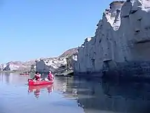 Boaters in the White Cliffs section of Missouri River in the Missouri Breaks (LaBarge Rock not pictured)