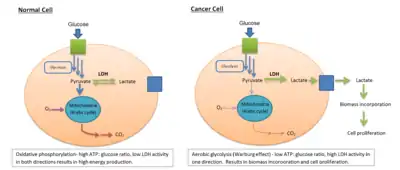 LDH is involved in tumor initiation and metabolism. Cancer cells rely on increased glycolysis resulting in increased lactate production in addition to aerobic respiration in the mitochondria, even under oxygen-sufficient conditions (a process known as the Warburg effect[38]). This state of fermentative glycolysis is catalyzed by the A form of LDH. This mechanism allows tumorous cells to convert the majority of their glucose stores into lactate regardless of oxygen availability, shifting use of glucose metabolites from simple energy production to the promotion of accelerated cell growth and replication.