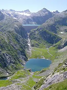 The lake with Cavagnoli dam and Lago Bianco in the foreground