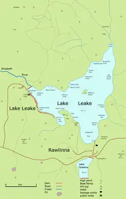 The lake can hold 22.076 gigalitres (779,600,000 cu ft) of water.[2] The lake was named after Charles Henry Leake (1819-1889), a member of the Tasmanian Legislative Council.[3] At the 2006 census, Lake Leake had a population of 176.[1]