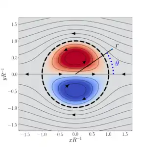 Since the seminal work of P. Orlandi,[2] the Lamb–Chaplygin vortex model has been a popular choice for numerical studies on vortex-environment interactions. The fact that it does not deform make it a prime candidate for consistent flow initialization. A less favorable property is that the second derivative of the flow field at the dipole's edge is not continuous.[3] Further, it serves a framework for stability analysis on dipolar-vortex structures.[4]