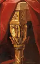 Rhode Island had statehouses in both Providence and Newport (until 1901). The Rhode Island General Assembly commissioned 2 copies of the Munro-Lenox portrait in 1800, one for each statehouse.[8]: 89 The elaborate wooden frame was carved and gilded by Martin Jugiez, a Philadelphia carver.[23] Both portraits (and their ornate frames) were transported by ship from Philadelphia, and arrived at Newport in October 1801.[lower-alpha 5] |