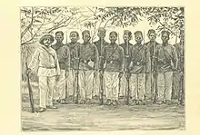 The term laptot probably derives from the word lappato bi in the Wolof language, referring to interpreters, intermediaries or brokers.[1] Most laptots were recruited in Senegal, especially at French outposts in Saint-Louis and Dakar, during the late 18th and 19th centuries. Laptots were closely linked with the Tirailleurs sénégalais, a military unit which enlisted soldiers from France's colonies in West Africa, founded in 1857. Unlike the tirailleurs, however, laptots served exclusively in Africa and Madagascar.[2]