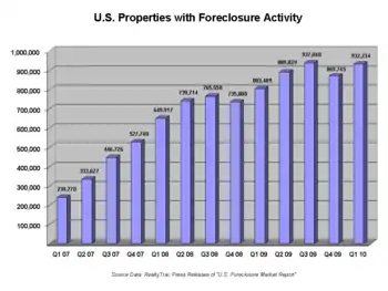 The United States entered 2008 during a housing market correction, a subprime mortgage crisis and a declining dollar value.[2] In February, 63,000 jobs were lost,[3] a 5-year record.[4] In September, 159,000 jobs were lost, bringing the monthly average to 84,000 per month from January to September 2008.[5]
