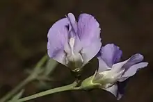 The flowers are blue to purple, blooming early in spring,[3] usually growing to at least 18 millimeters. The leaves are mostly greater than 3 centimeters. The keel is 2–4 mm shorter than the wing petals.[2]