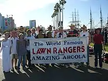 Founded in 1980 by two men - from Arcola, Illinois, and LaGrange, Illinois, the Lawn Rangers are not the first of their kind. The men, Pat Monahan and John O'Halloran, decided that they wanted to be in their hometown parades, the annual Broom Corn Festival parade and the LaGrange Pet Parade, so they started to think about what skills they possessed. After deciding that they didn't have any, their wives told them that the only common skill they had was for mowing the lawn. Since Pat Monahan was part owner of the Thomas Monahan Broom Company, they decided to push lawn mowers and toss brooms in the parade. They still needed a name for what they were doing. Clayton Moore, the original Lone Ranger, was the Grand Marshal of that year's Broom Corn Parade, so they became the World Famous "Lawn Rangers". Over the years the Lawn Rangers have lived life by their motto: You're only young once, but you can always be immature.