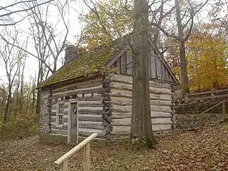 Originally located on Darby Creek, it was moved and rebuilt at Karakung Drive (Powder Mill Valley[3]) 1961 by the Haverford Township Park Commission when threatened with destruction.[4] The building was officially dedicated and reopened on 7 October 1961.[1] Various tours and fundraising events occurred throughout the 1960s in order to raise funds to continue renovation and restoration of the building.[5][6] 1966 saw the donation of a colonial wool-spinning wheel to the Cabin by the Pennsylvania Historical and Museum Commission, courtesy of the Landis Valley Museum.[7]
