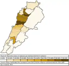 The Lebanese Maronite Christians are believed to constitute about 30% of the total population of Lebanon according to election results.[1] Lebanon's constitution was intended to guarantee political representation for each of the nation's ethno-religious groups.[2]