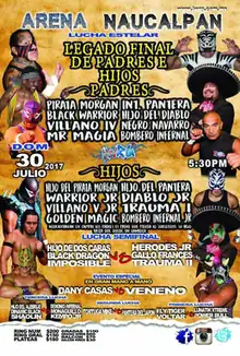 professional wrestling has been a generational tradition in Lucha libre since its inception early in the 20th century, with a great deal of second or third-generation wrestlers following in the footsteps of their fathers or mothers.[2] Several lucha libre promotions honor those traditions, often with annual tournaments such as Consejo Mundial de Lucha Libre's La Copa Junior.[3] The Naucalpan, State of Mexico based International Wrestling Revolution Group (IWRG) has held a Legado Final (Spanish for "Final Legacy") on an almost annual basis since 2011, with the 2017 show marking the sixth time they used the name. The Legado Final show, as well as the majority of the IWRG shows in general will be held in "Arena Naucalpan", owned by the promoters of IWRG. In addition to legitimate second-generation wrestlers there are a number of wrestlers who are presented as second or third-generation wrestlers, normally masked wrestlers promoted as "Juniors". These wrestlers normally pay a royalty or fee for the use of the name, using the name of an established star to get attention from fans and promoters.[2] Examples of such instances of fictional family relationships include Arturo Beristain, also known as El Hijo del Gladiador ("The Son of El Gladiador) who was not related to the original El Gladiador, or El Hijo de Cien Caras who paid Cien Caras for the rights to use the name.[4][5]