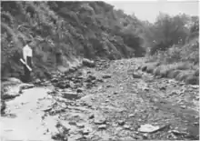 A historic Native American path used to pass through the water gap of Leggetts Creek on its way from the headwaters of the Lehigh River to the Great Bend in the Susquehanna River near the Pennsylvania/New York border.[19] Thomas Meredith conceived the idea of a railroad going from the mouth of the creek at Providence to the Great Bend on the Susquehanna River, a distance of 48 miles (77 km), in 1826.[20] Names such as the "Lackawannock and Susquehanna Railroad" and the "Meredith Railroad" were considered, but eventually the name "Leggetts Gap Railroad" was settled on.[20] The railroad was first chartered in 1832, but no progress was made until 1849.[21] The Rockwell Mine at Leggetts Gap was opened in 1854.[22] The Leggetts Creek Colliery was operational in the early 1900s. Additionally, a ledge in the vicinity of the creek was quarried extensively by the early 1900s.[13]