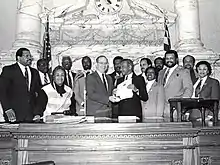 Parren Mitchell receiving a Maryland House of Delegates citation from the Legislative Black Caucus of Maryland and House Speaker Ben Cardin on the occasion of his retirement. (from l-r: Delegates Elijah Cummings, Clarence Davis, Hattie Harrison, John Douglass, Nathaniel Oaks, Ben Cardin, Pete Rawlings, Parren Mitchell, Curt Anderson, Ruth Kirk, Ralph Hughes, Larry Young, Wendell Phillips, Margaret "Peggy" Murphy