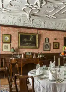 Shuffrey & Co also designed and made decorated ceilings, chiefly in 'fibrous' plasterwork but also in wood. In 1893, Shuffrey was asked to design ceilings at Wightwick Manor near Wolverhampton, which was being built by Edward Ould for Theodore Mander, of the Mander family.[32] The billiard and dining room ceilings which he created are in the Jacobean style with pendants, and with ornate friezes below.[33] Other artists and designers commissioned to decorate and furnish the old english style manor were Charles Eamer Kempe, who designed stained glass windows, and William Morris.[32][34]