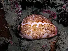 | A live individual of Leporicypraea mappa with the mantle mostly retracted | |