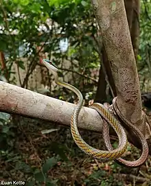 L. ahaetulla feeds on small birds and their eggs, lizards, frogs and their eggs, and insects such as grasshoppers.[5] It is also known to show cannibalism and feed on other snakes which is a rare behaviour.[5]