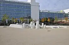 The park is full of wide gravel and grass areas that are partly planted with trees. The white concrete sitting wall which encircles the bullet catcher for the former shooting range forms a giant, 155-m-long «tree pot» which gives the site its particular character. The bench that runs around is integrated in the wall and is illuminated at night.[4] The randomly placed Gleditsia provide an airy atmosphere with their slender, light green foliage. The park is complemented with a pool, stage, and a play area.[5] The blue Leutschen light that shines at night floats between the treetops. The light installation, which was developed by the artist Christopher T. Hunziker provokes memories of the Leutschenbach stream which flows under the surface and accompanies the visitors on their stroll through the park. A small fountain provides the soundtrack for this.[6]
