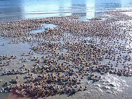 Initially, the crabs feed only tentatively, and within 15 minutes of emergence, they begin the "trek", where large numbers of crabs walk simultaneously towards the water in an almost straight line.[4] Mictyris species are among the few crabs adapted to walking forwards, rather than sideways.[3] Juveniles only proceed about 50 m towards the water, and feed at that level of the beach.[4]
