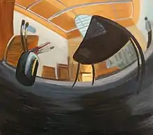 The main topics of the paintings depicting the reflections are mostly inner spaces and female figures. She reflects the world in a convex mirror and she further interprets this view in the arrangement and painting of her pictures. [2]