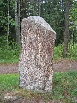 Runic inscription U Fv1972;172 is the Rundata catalog number for a granite runestone that is 1.6 meters in height. It was discovered while digging a trench for an electrical cable on December 19, 1971, and raised at this spot, which is believed to be the stone's original location.[1] Its inscription consists of an intertwined serpent that is above a runic band that cuts across the bottom of the inscription. This inscription is classified as being carved in runestone style Pr4, which is also known as Urnes style.