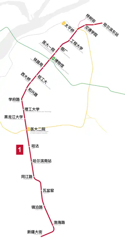 Line 1 of the Harbin Metro (Chinese: 哈尔滨地铁一号线; pinyin: Hārbīn Dìtiě Yī Hào Xiàn) is a rapid transit line running from west to east Harbin. It was open on the 26 September 2013. This line is 26.05 km[1] long with 23 stations.