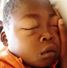 Minimal change disease (also known as MCD, minimal change glomerulopathy, and nil disease, among others) is a disease affecting the kidneys which causes nephrotic syndrome.[1] Nephrotic syndrome leads to the loss of significant amounts of protein in the urine, which causes the widespread edema (soft tissue swelling) and impaired kidney function commonly experienced by those affected by the disease.[1] It is most common in children and has a peak incidence at 2 to 6 years of age.[2] MCD is responsible for 10–25% of nephrotic syndrome cases in adults.[3] It is also the most common cause of nephrotic syndrome of unclear cause (idiopathic) in children.[3]